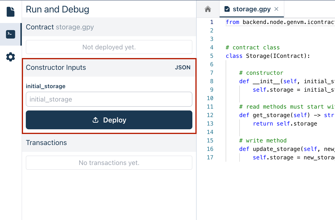 The GenLayer Studio automatically detects the constructor parameters from your code. It analyzes your __init__ method to identify the parameters and their types. This automatic detection ensures that you have the correct inputs for initializing your contract. It’s important to have clear type annotations for each parameter (e.g., str, bool, int, list) to enable accurate detection.